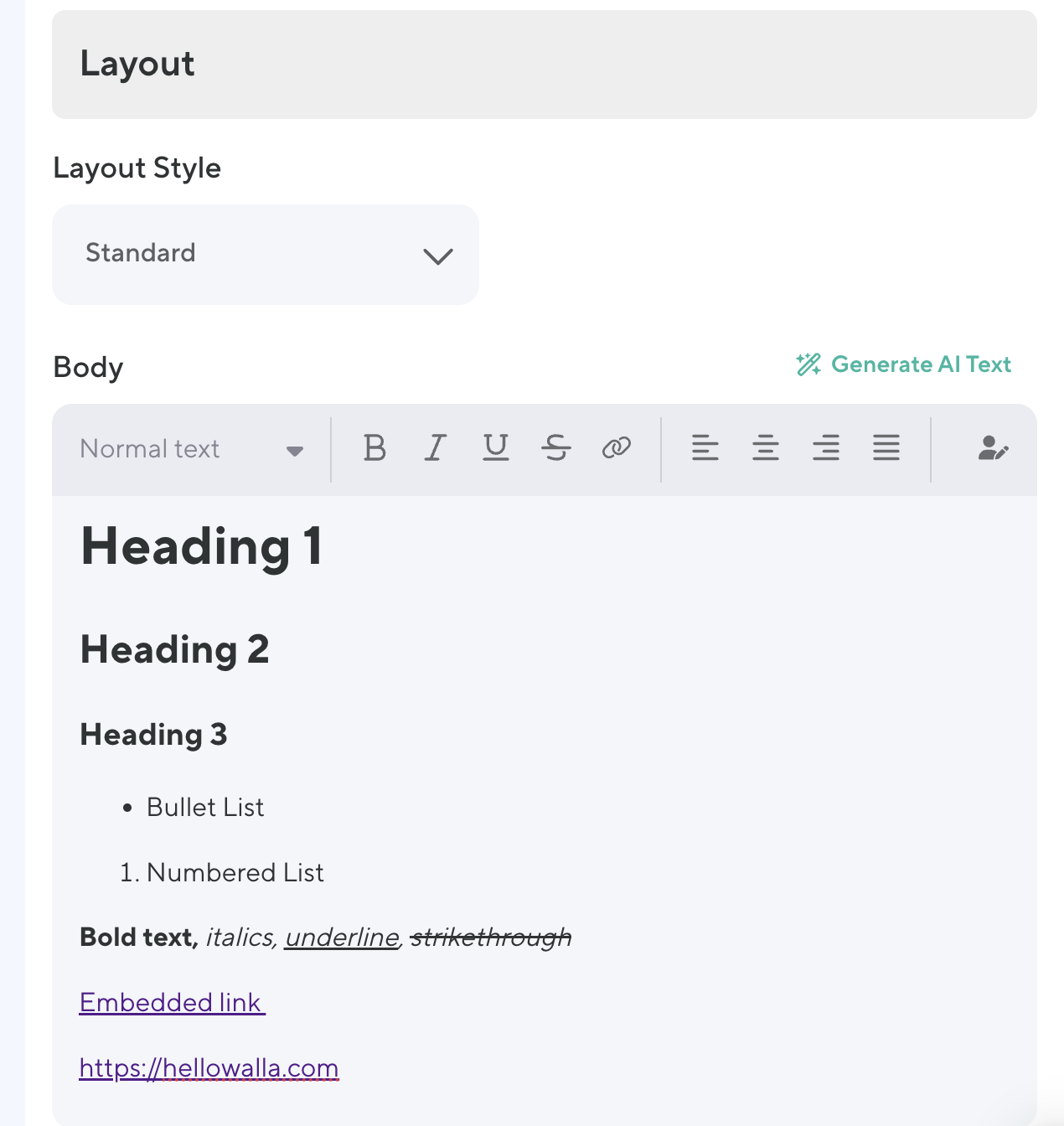 Once you've opened the email editor, scroll down to Layout. Under Layout Style, select if you will be using the Standard Editor or the Advanced Editor. The Standard Layout is automatically selected for new emails.