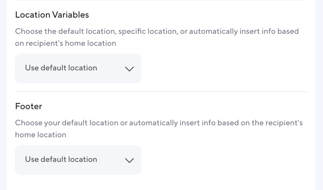 Location Variables is a setting that determines what location information will be displayed in your email. You can choose from Default Location, Specific Location, or Client Home Location. Whichever option you choose will correspond with the contact information for any personalization parameters that you add to your message, such as location reply to email or location from email.