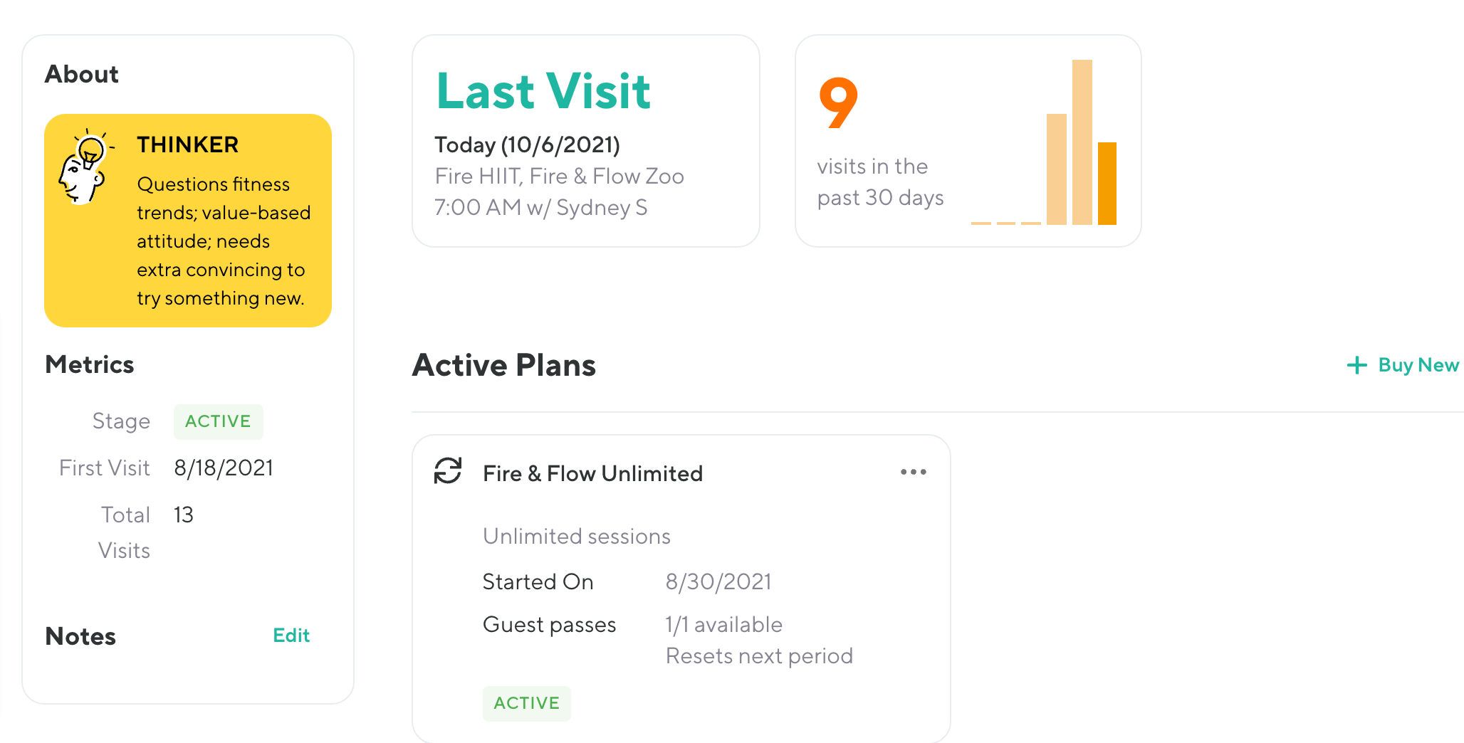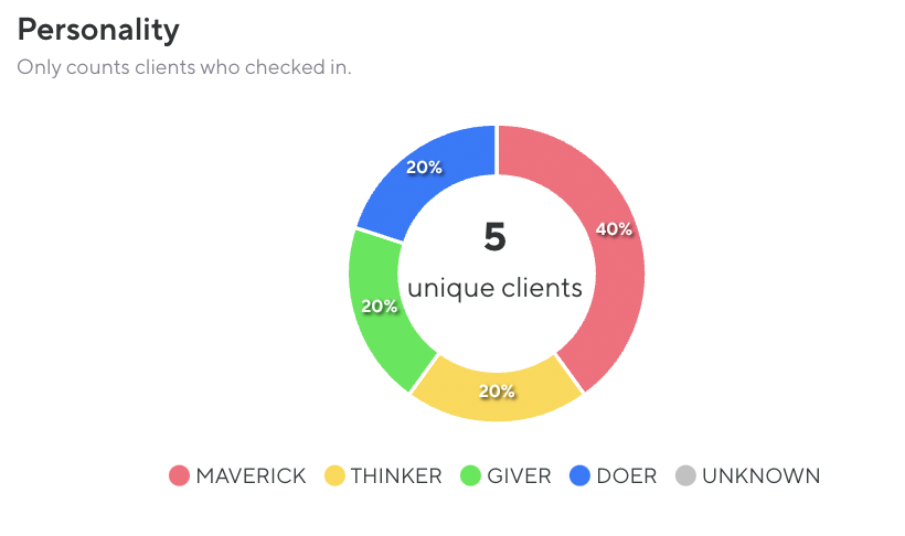 There are two places where you can find your client’s personality type once they have completed the quiz: the Client Profile and in the Class Sign-In page. The About section under the Client Profile is where you will find out if your client has taken the personality quiz. If they have, you will see their personality profile, along with a short description of that personality type. Each personality type has a corresponding color. When a client completes their quiz, their photo will be outlined with their corresponding personality color both on the class sign-in page and on their client profile.