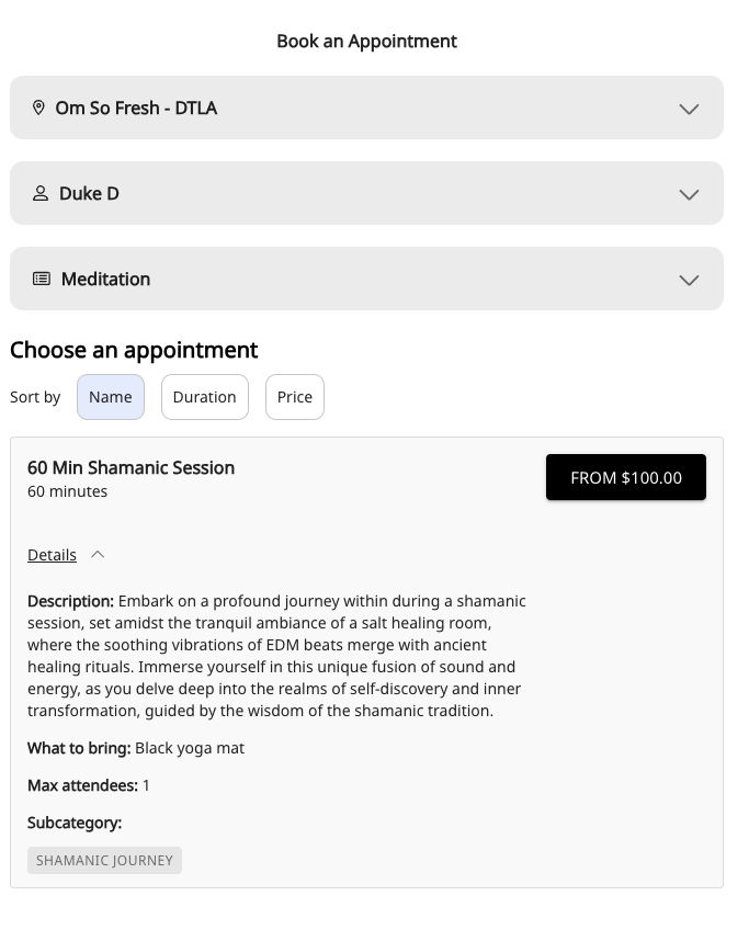 Step 3: After choosing an appointment category clients can view appointment details and choose their appointment type if there are multiple options for the appointment category.