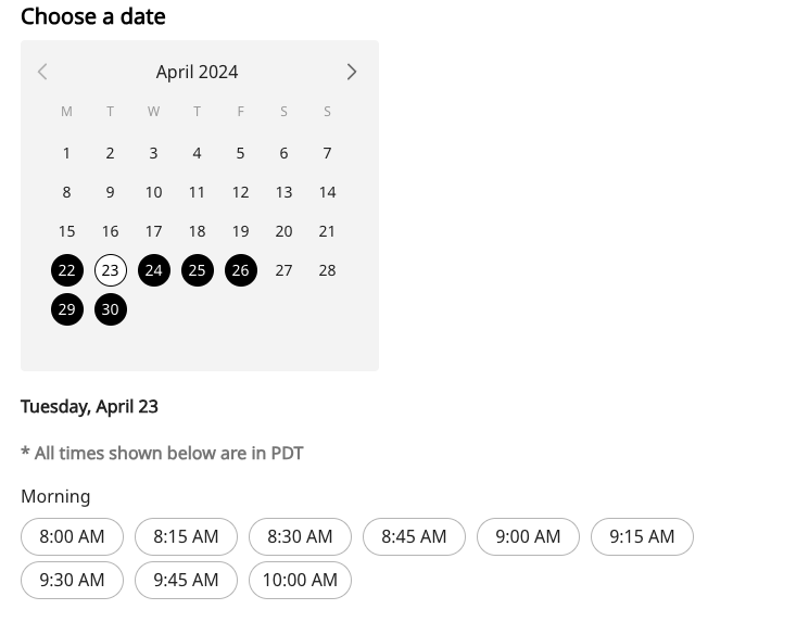 Step 4: Select an appointment date and time. Dates and times are reflected in the studio's timezone.
