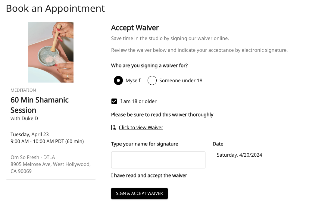 Step 5: If the studio has a waiver and you have not signed the waiver yet, you will be required to do so prior to booking.