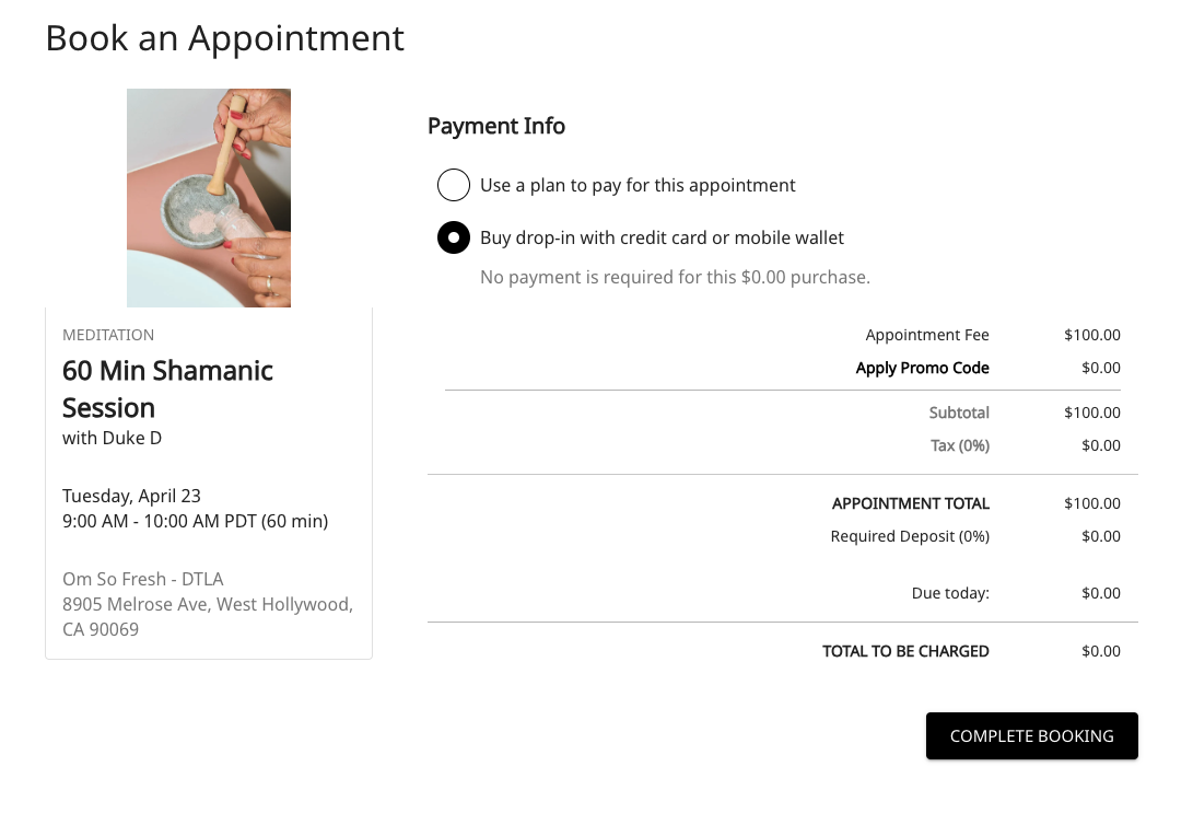 Step 7: Review the details at checkout and select Complete Booking to book the appointment. After booking, you will be presented with an appointment purchase confirmation page that includes your appointment details.