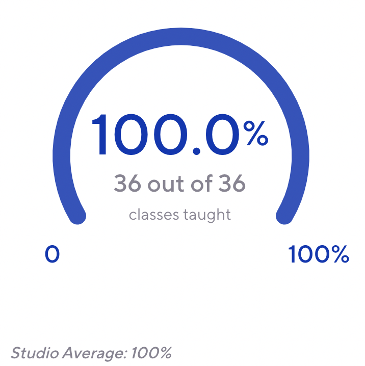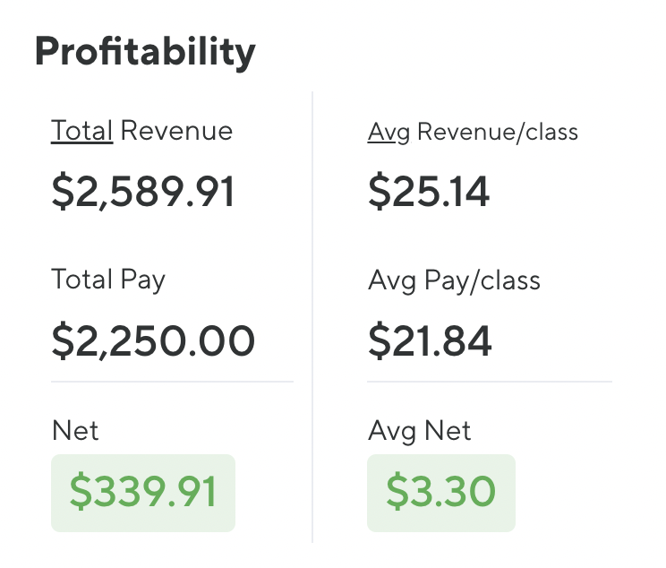Average Revenue per Class: Average revenue per class over the selected period. The average generated by each class taught by an instructor is calculated by summing together the total revenue for each class instance the instructor taught over the selected period. This total is then divided by the number of classes the instructor taught in the selected time period to determine the average revenue per class.
