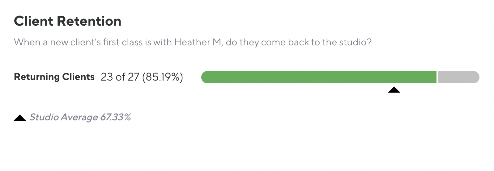 Average number of clients per class: The average number of checked-in clients per class based on all classes taught by a particular instructor over a selected period. Average clients per class for an instructor is calculated by taking the total number of all checked-in clients for all classes taught by the instructor during the selected period divided by the number of classes taught by the instructor.