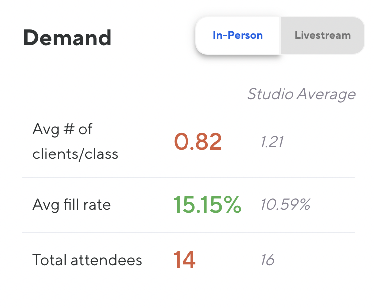 Filter by in-person and livestream rosters. Stats in green indicate the instructor’s stat is higher than the studio’s average.