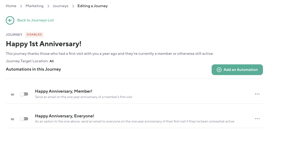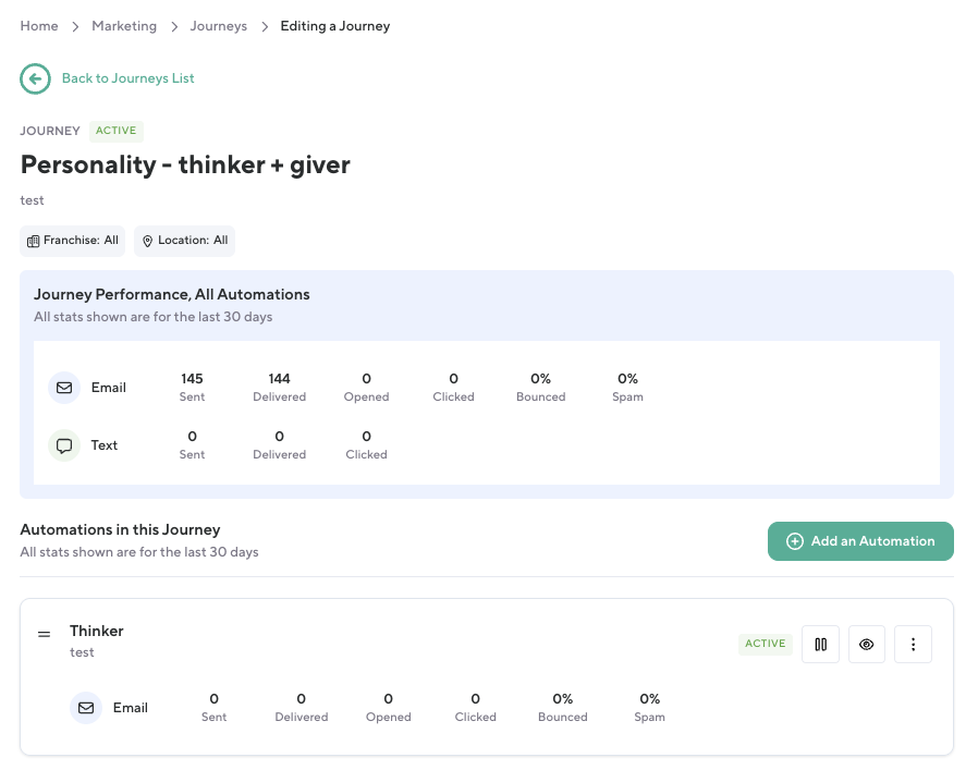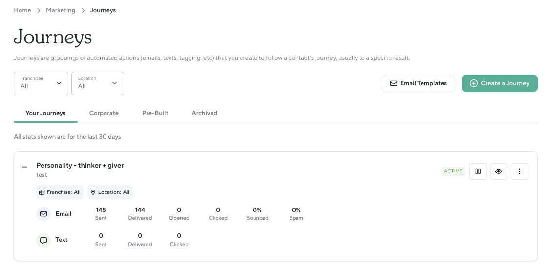 Before this update, it was difficult to analyze how individual journeys or their automations were performing across different locations. Teams had limited visibility into which channels (email vs. SMS) were most effective and couldn’t easily switch between journeys and automations for comparison. With improved filtering and per-location insights, teams can more easily measure engagement and optimize communications across multiple sites.