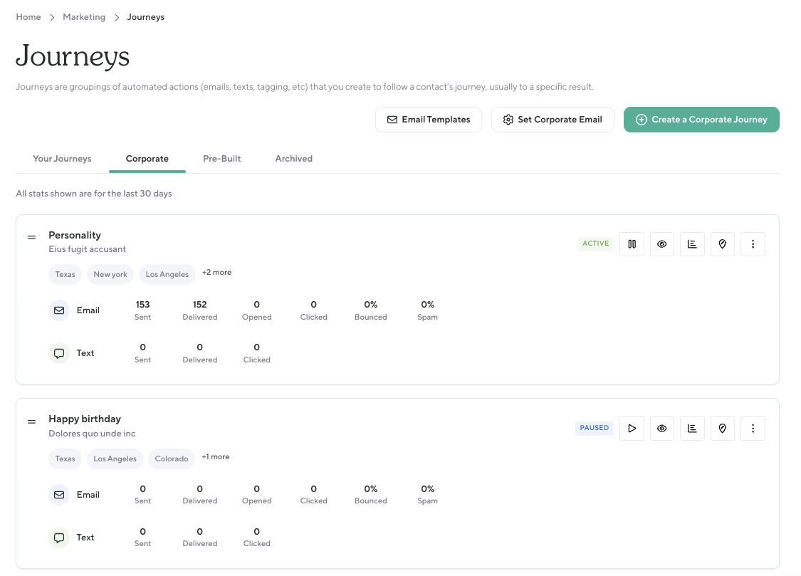 Journeys are groupings of automated actions (emails, texts, tagging, etc) that you create to follow a contact’s journey, usually to a specific result.