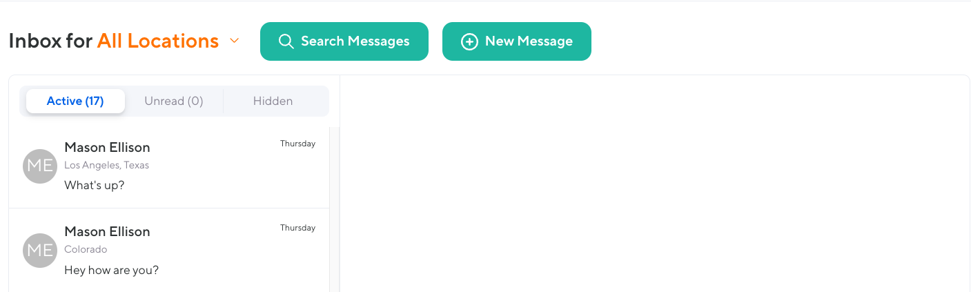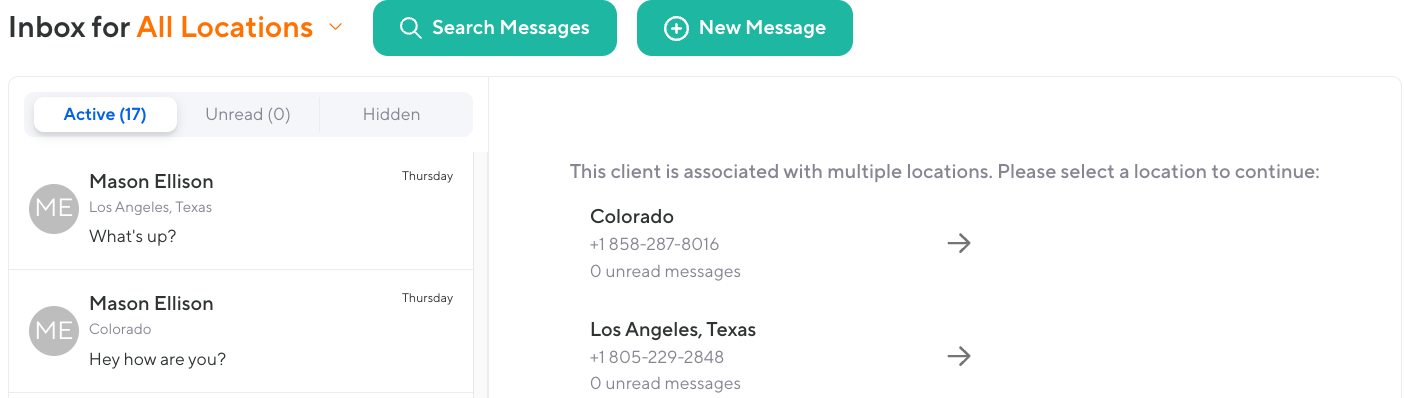 If you have not set up multiple phone numbers, this dropdown will work like the location filter did before this change. If a client has multiple associations and has sent messages to multiple locations phone numbers, you will see both conversations separately for that client.