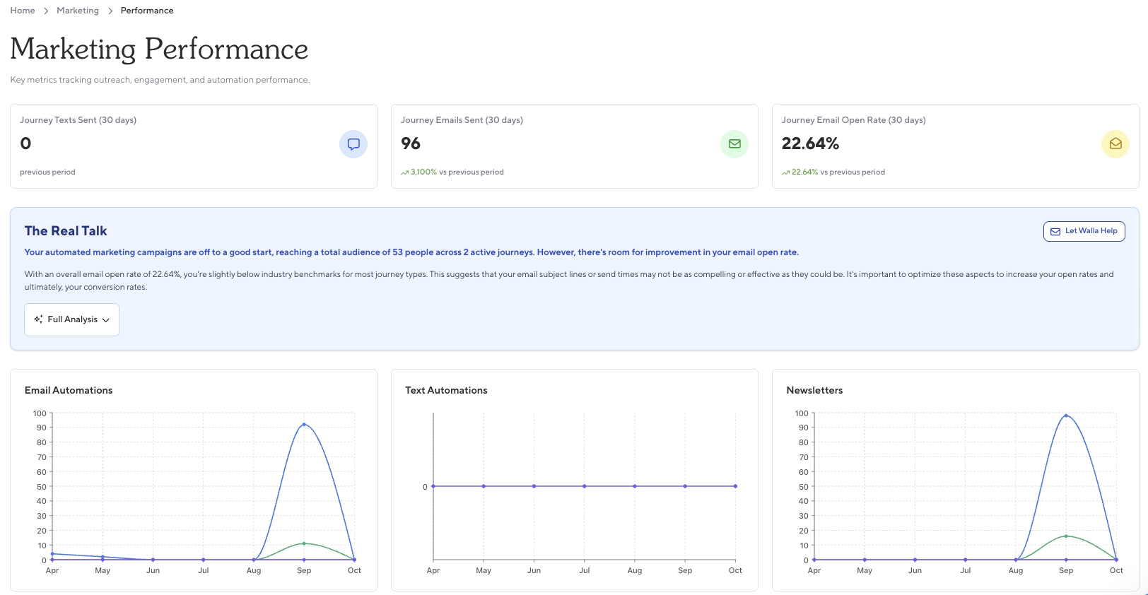 Provide a centralized, data-driven overview of marketing performance, enabling studios to quickly assess effectiveness across email, text, and journey campaigns.