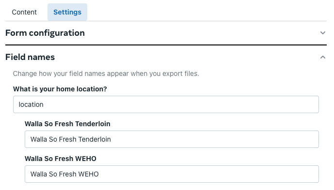 Enter the names of each location under each answer. You must enter the name of the location exactly as it is entered under Locations on the Location tile within Walla. The other fields besides the Multiple Choice question and answers do not need to be updated under this section. See the example below.
