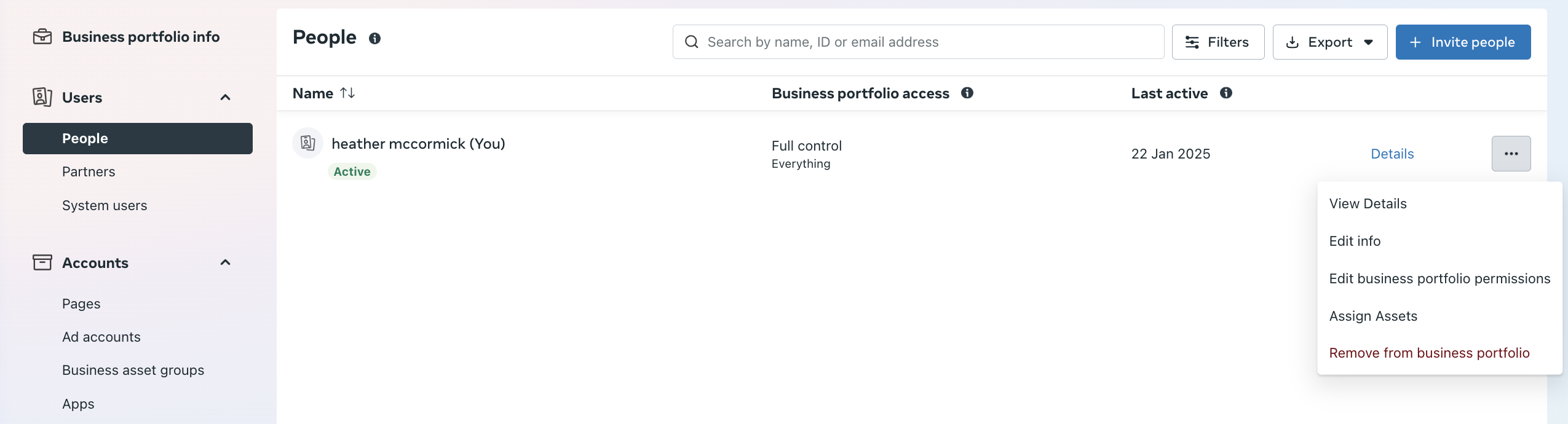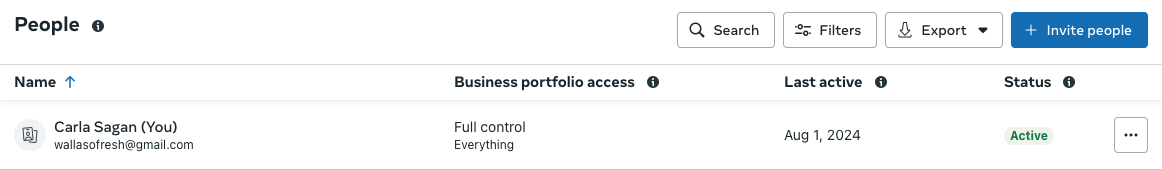 Ensure the person who will manage Meta lead forms is listed. If not, click Invite People and add the user