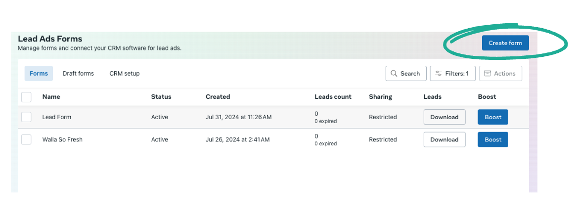 Log in to Meta Business Suite and create your form. You do not create the form in Walla. When the integration is set up correctly and you have settings set up correctly in Meta, the form will appear in Walla automatically.
