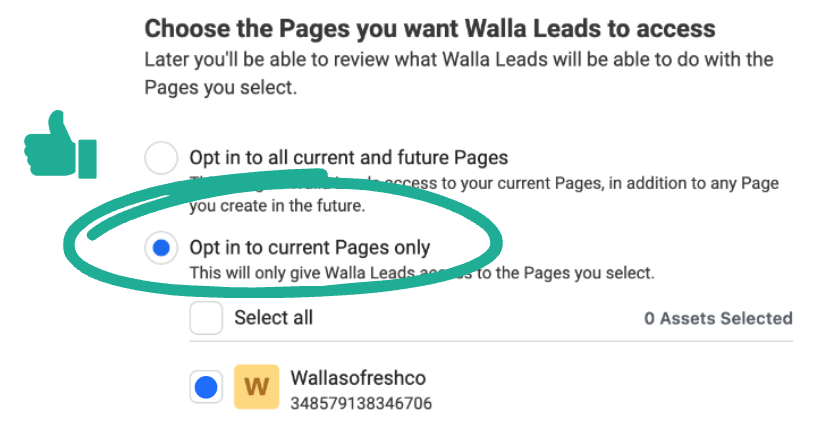Under the Choose the Pages that you want Walla Leads to access pop-up make sure Opt in to current Pages only is selected