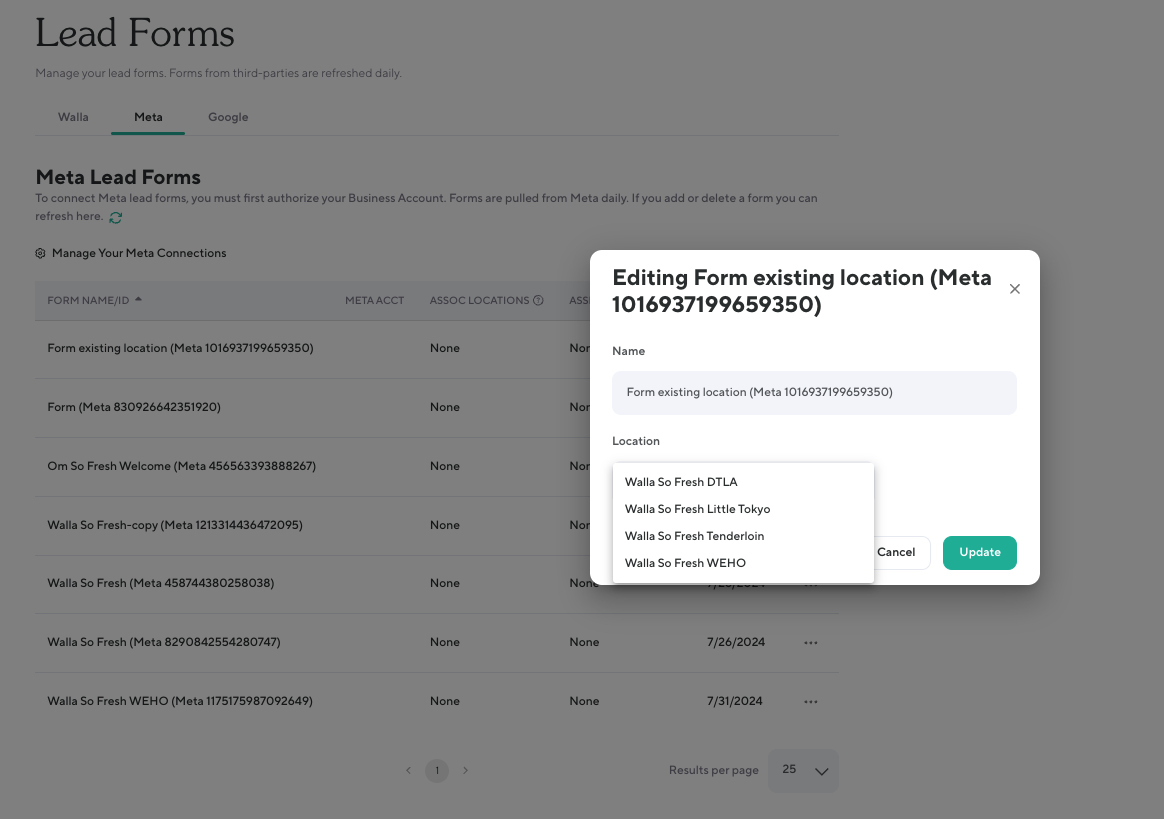 Make sure the form is listed under Walla Lead Forms. For multi-location businesses and franchises, you will need to select the appropriate franchise or location from the Location option under the Lead Form. The form will note it is from Meta and will have a unique lead form number