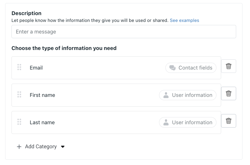 Select Add Category and choose User Information First Name