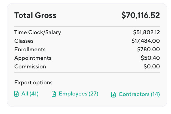 Sum of Time Clock/Salary, Classes, Enrollments, Appointments, and Commission pay for the selected period.