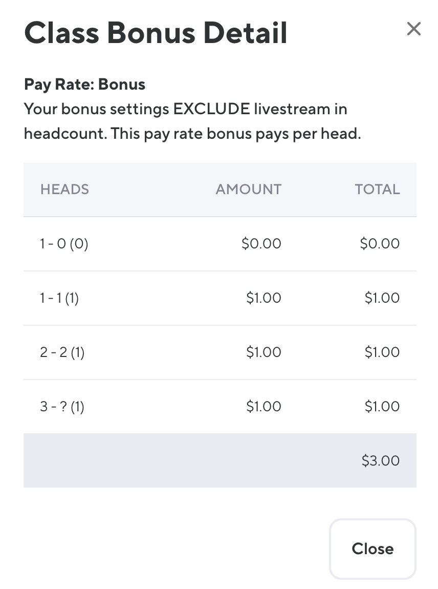 Clicking on the bonus amount when the pay has a bonus will generate a 'Class Bonus Detail' pop-up, providing a breakdown of the bonus settings for pay rates with either a bonus that is a per head bonus or a flat fee for reaching goal.