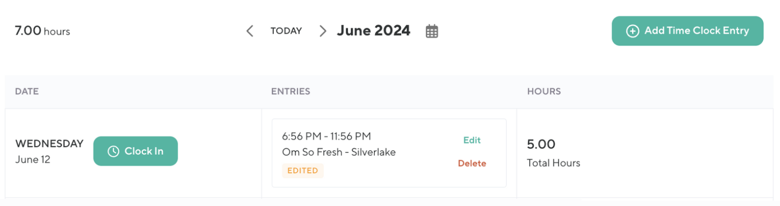 Select the teal edit pencil next to the total to Edit Timeclock. View staff clock in and clock out notes by selecting the grey notebook. Once notes are entered they can not be edited.