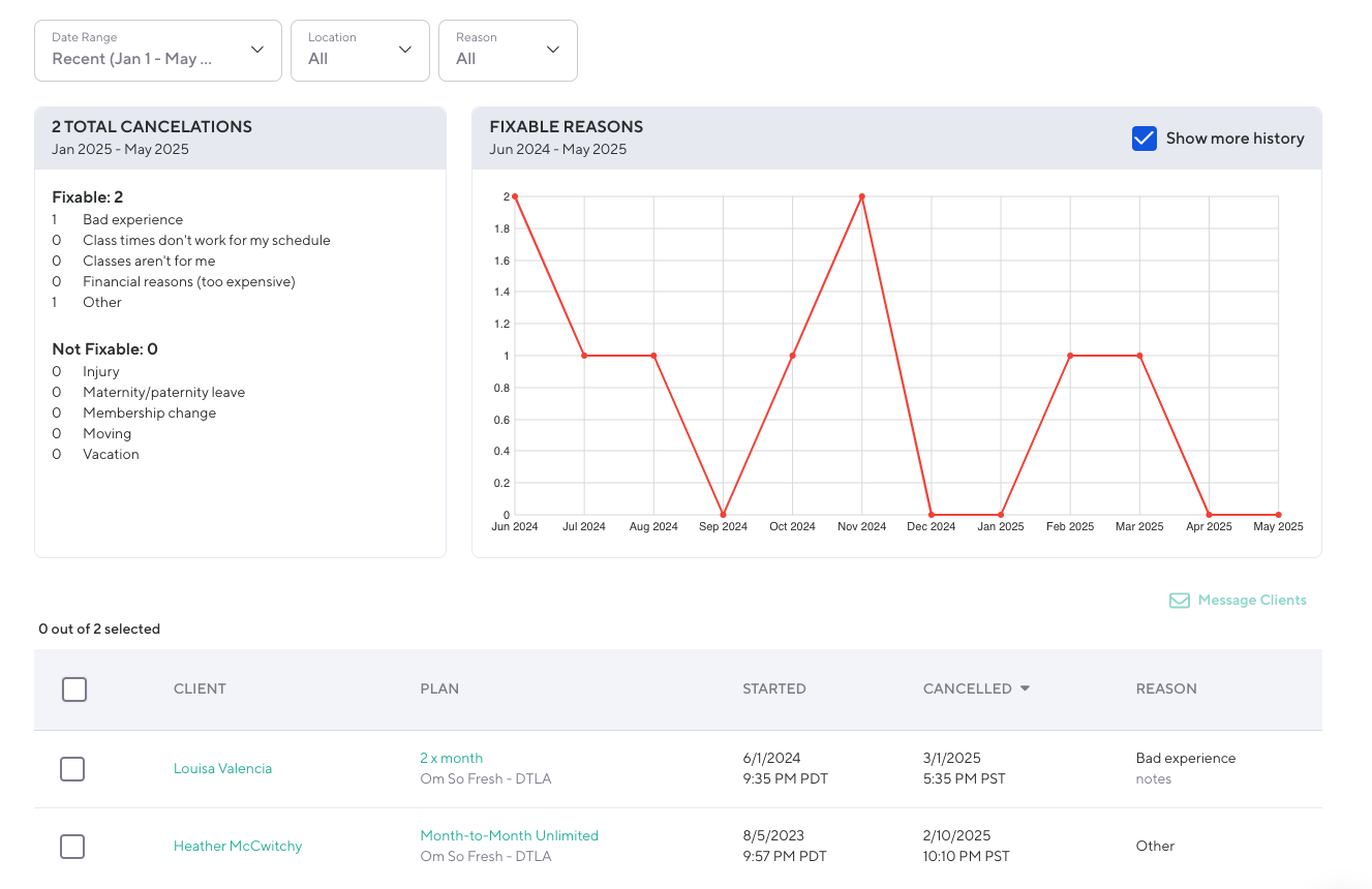 The Plan Cancellations report helps you track and analyze membership cancellations at your studio. This tool allows you to identify trends, understand why members leave, and develop strategies to improve retention.