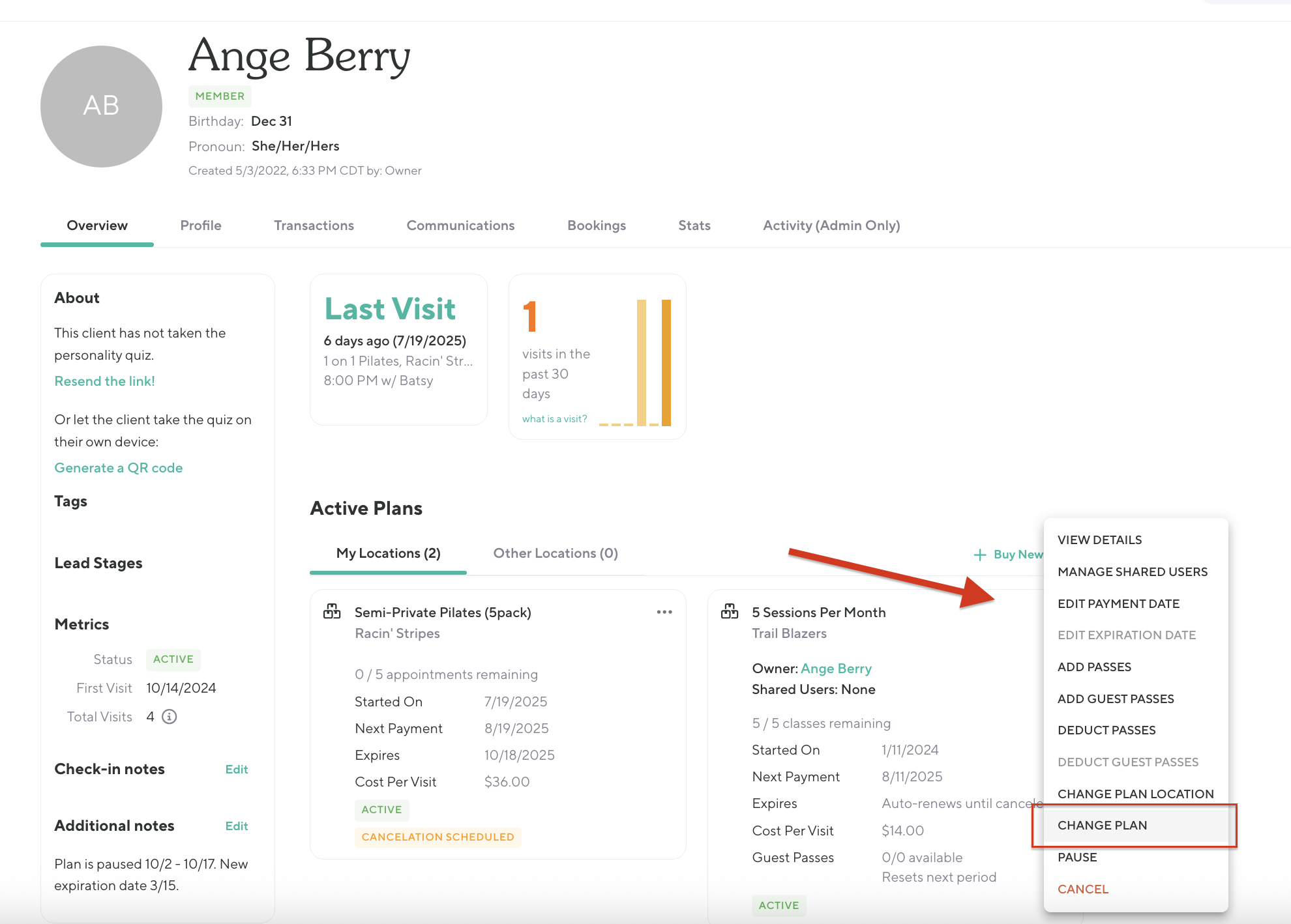 You’ll find this feature in the Client Profile under the Overview tab. To use the Plan Change feature, follow these steps: