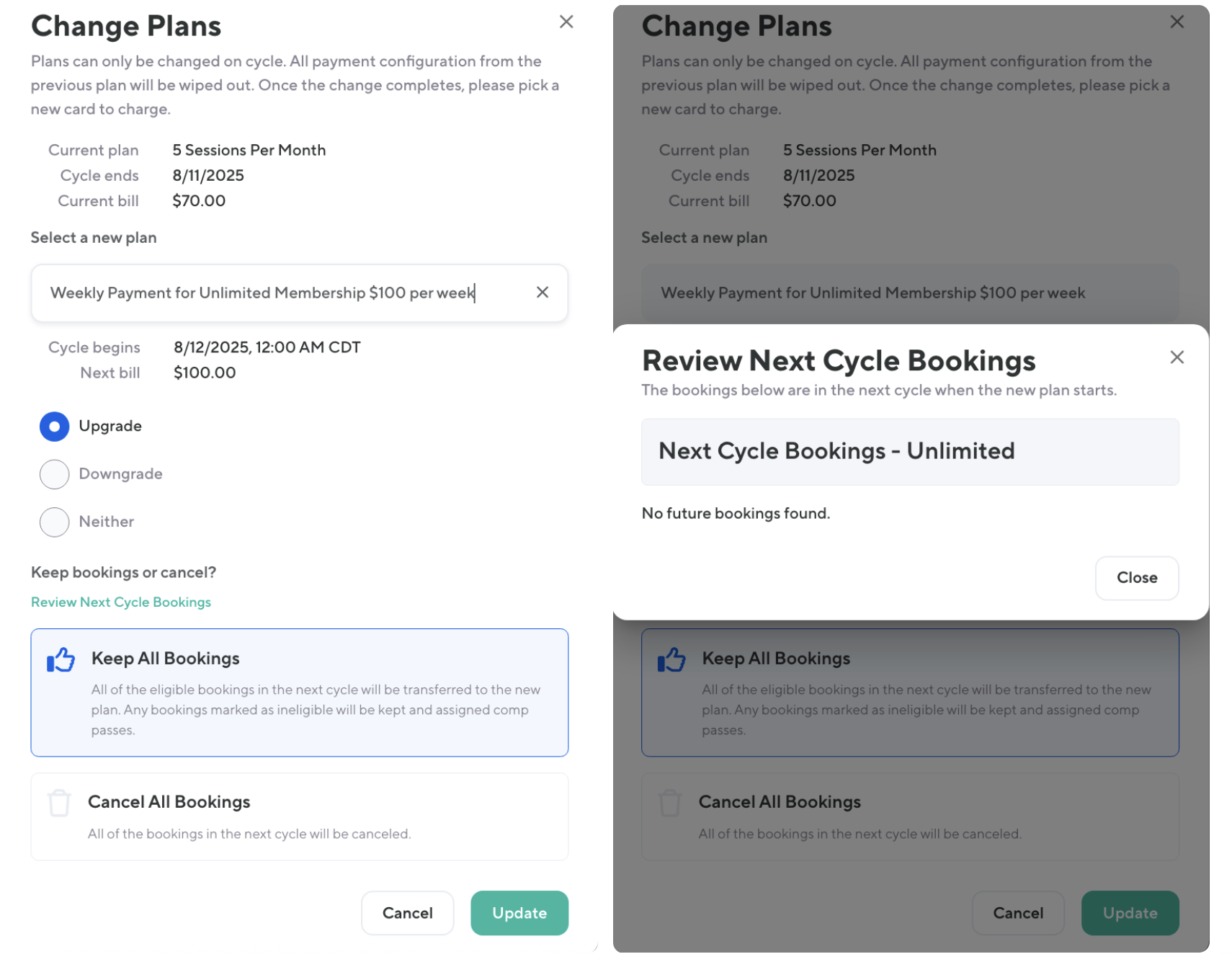 ✅ Always review next cycle bookings before finalizing a plan change to make sure no classes are missed.
