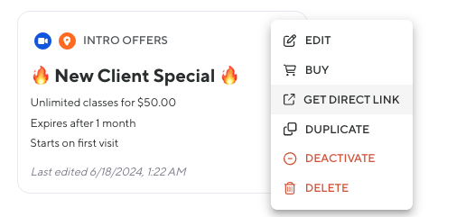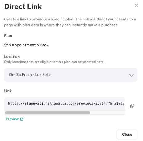 Generate a Direct Link for any plan—making it easy to promote memberships, packs, or special offers in just a few clicks. Whether you're linking from your website or including a plan in a marketing email, this is a quick way to guide clients straight to what you’re offering.