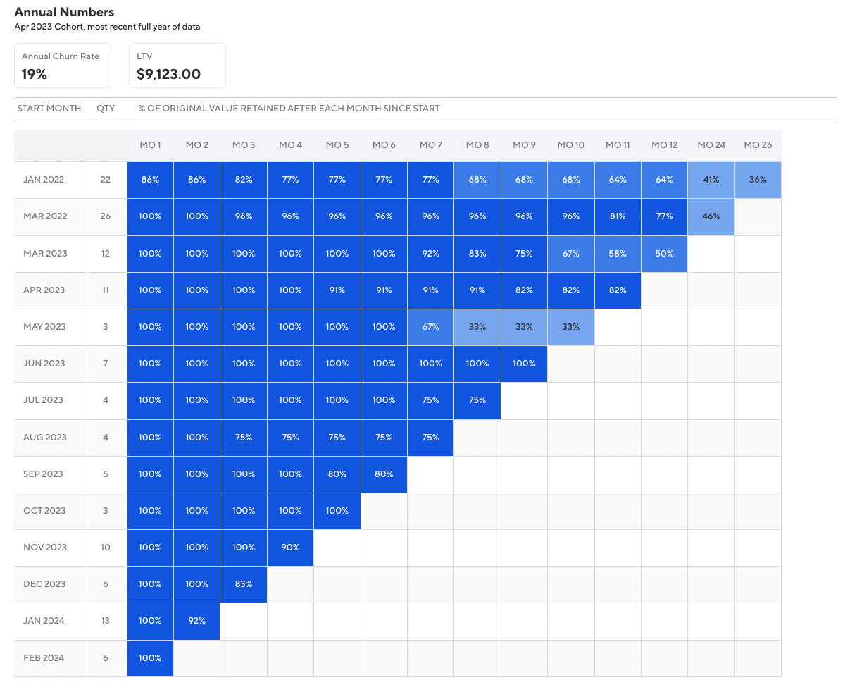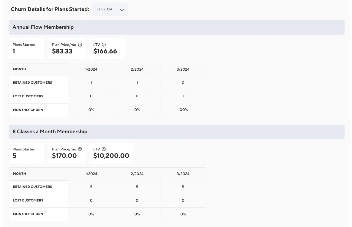 The Plan Retention Report offers real-time insights into structuring membership offers, nurturing long-term client relationships, and boosting revenue. The retention heat map offers an intuitive way to visualize plan retention rates. After the report generates, hover on any of the boxes to see the exact numbers that have retained from the original start date.