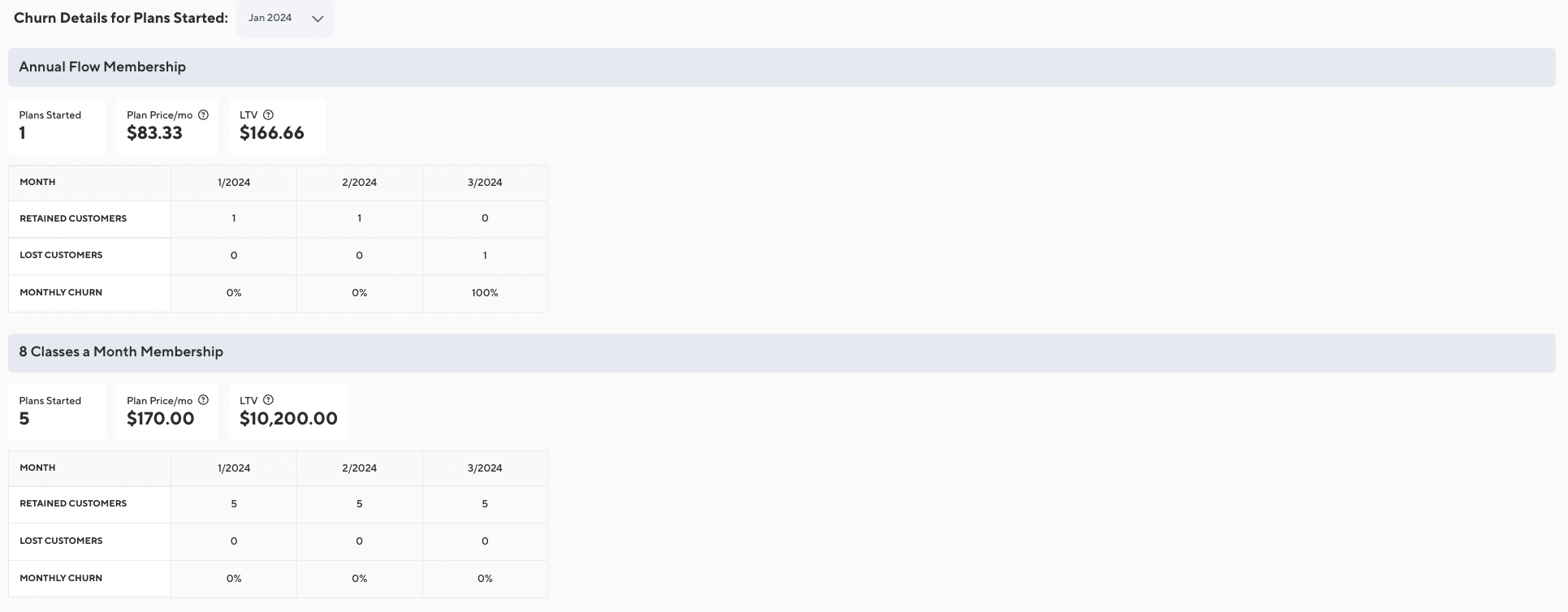 Select a month from the drop-down. A section will be generated for each selected plan. If there is no data to be displayed the Churn Details for Plans for the specific plan will be blank.