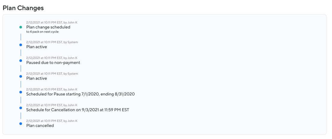 The Plan Timeline is a detailed log for most changes made to a client's plan. This feature helps with holding everyone accountable for updates made under Plan Management. It stands out as an indispensable tool for ensuring staff transparency, so your staff can respond effectively to client inquiries, such as understanding pause history or when a plan change was scheduled.