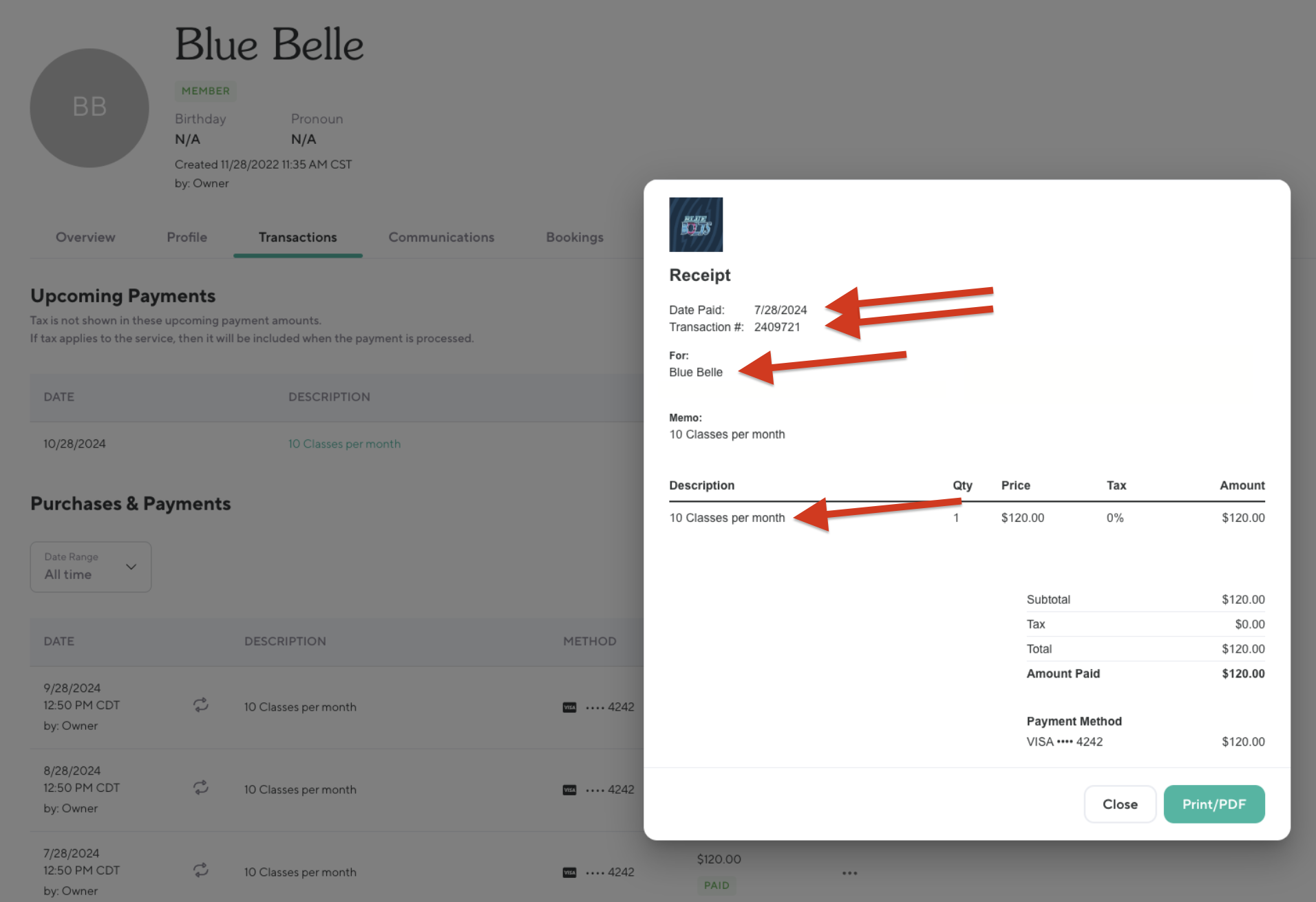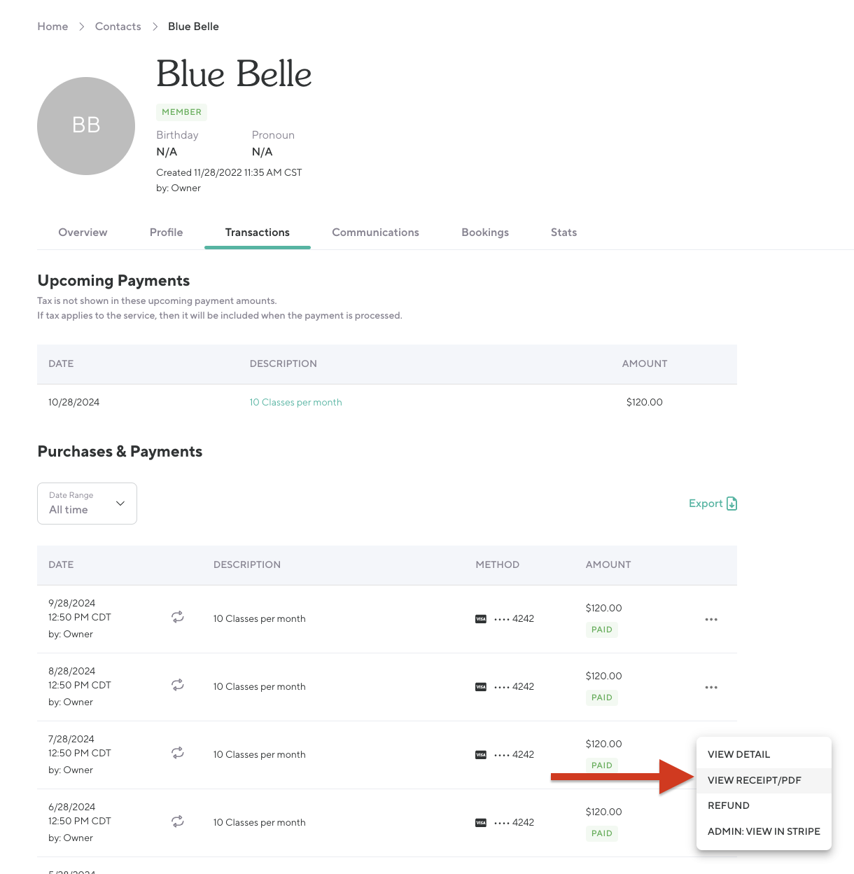 To quickly and easily find these details, open the client's Transactions tab, click the three dots to the right of the transaction and click View Receipt/PDF.