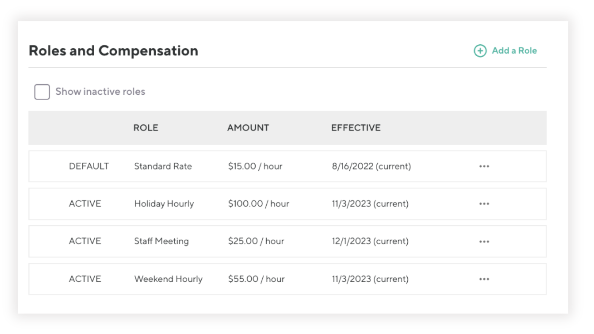 Roles are added from the Roles and Compensation table located in the Sensitive Info tab. Here you can easily add and edit roles for both employees and contractors, specifying rate types, effective dates, and compensation details. Once a role is created it can not be deleted, it can only be deactivated. You can delete roles that have future effective dates. However, if a role has a past effective date, you can't delete it; you can only make it inactive.