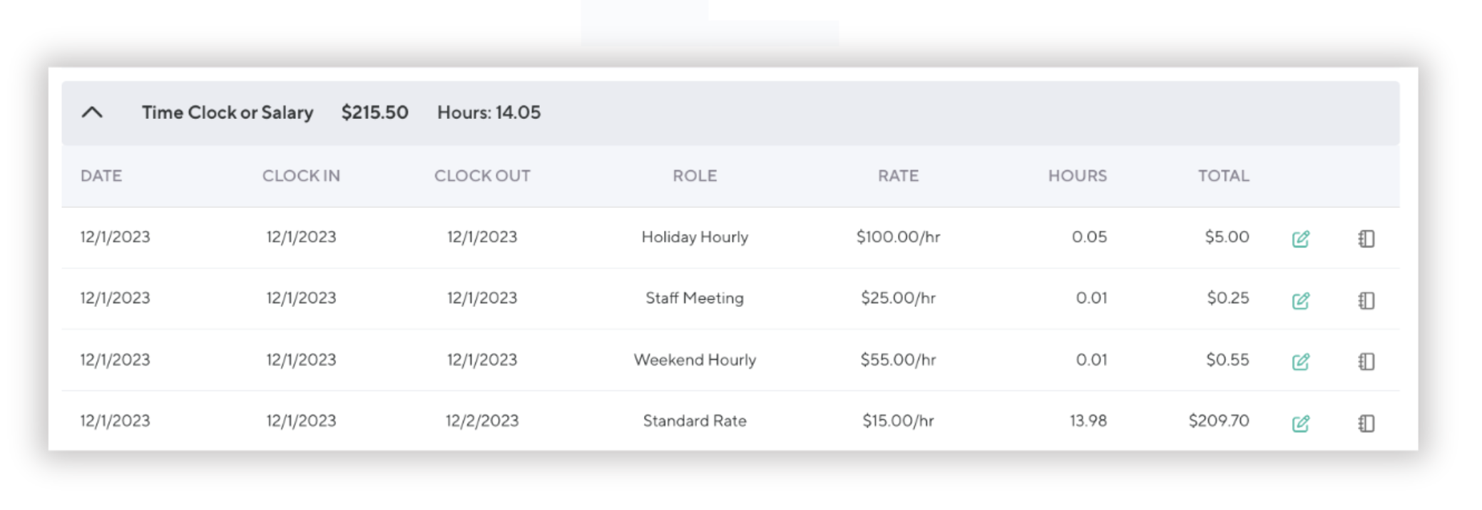 Role totals can be found under the Time Clock or Salary section of Payroll, either based on hourly rates for hours worked or predetermined salaries for the specified pay period.