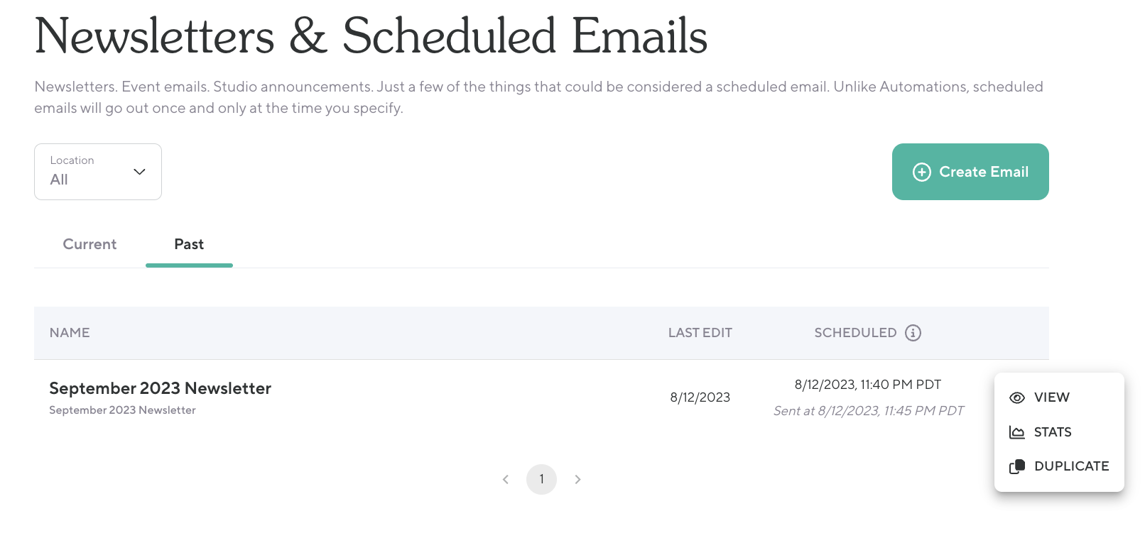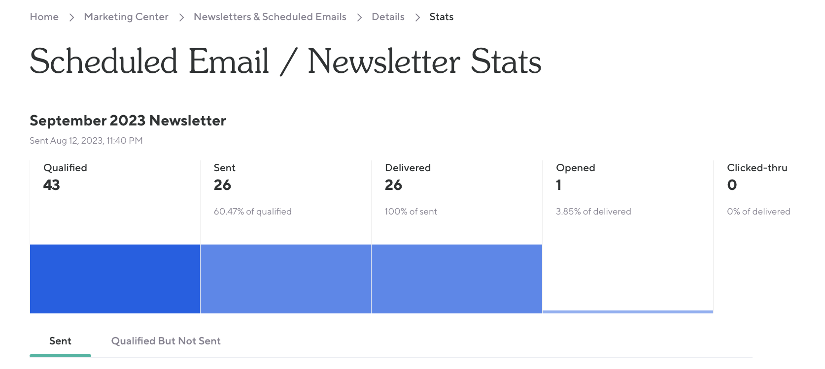 When a client is sent a newsletter or scheduled email you can check the following places to make sure it was sent: the Communications tab under the client profile and by selecting View Stats next to the sent email in the Marketing Center.