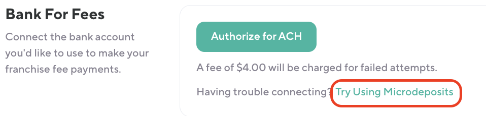 Franchisees can connect a bank account to receive fee transfers by verifying their account via ACH or micro deposits. We recommend trying ACH first, then switching to micro deposits if ACH fails. o