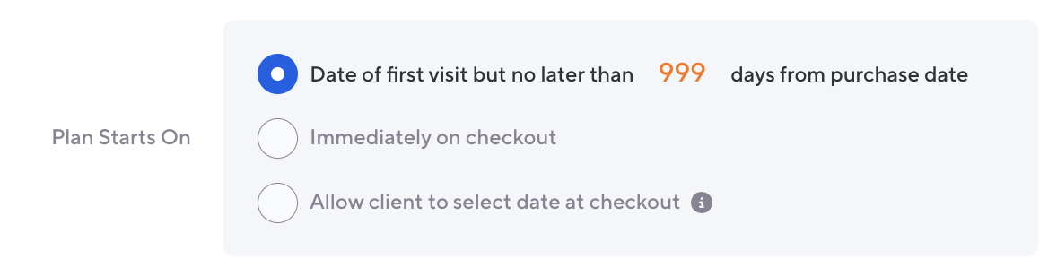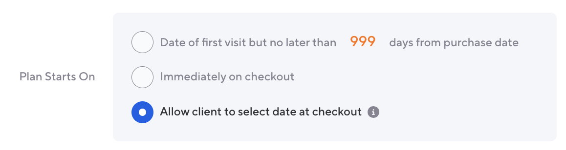 Plan starts on Allow client to select date at checkout: You will need to add in the plan description the date the client should choose for their start date. There is not a plan setting that is Starts on first visit and charge on first visit. Plans that start on first visit can only be charged immediately.