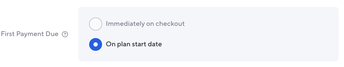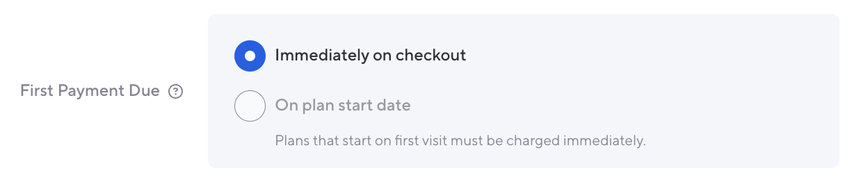 First payment due On plan start date: Clients will be charged the day their plan starts. Based on the previous setting, this will be the date chosen by the client.