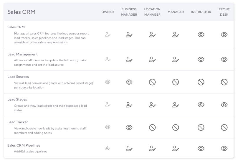 The Sales CRM permissions can be set for different staff roles including Owner, Business Manager, Location Manager, Manager, Instructor, and Front Desk.