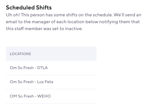 Scheduled ShiftsUh oh! This person has some shifts on the schedule. We'll send an email to the manager of each location below notifying them of this termination.