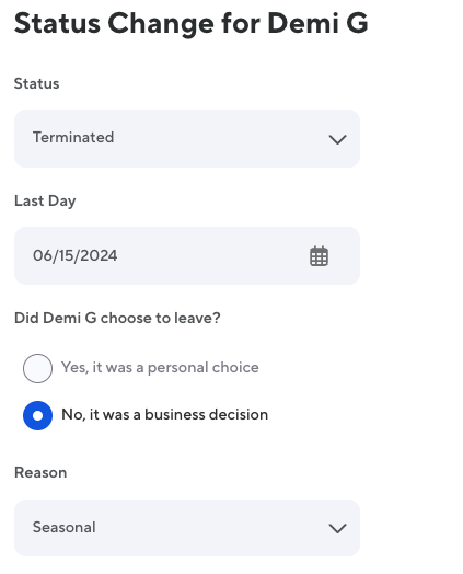 Choose the date the staff member officially no longer works at your business. You can choose a future start date. However, there is no indication or record that a staff member is scheduled to be terminated, even after saving. If you decide to change their status the same day, their staff tile will indicate that they have been terminated.
