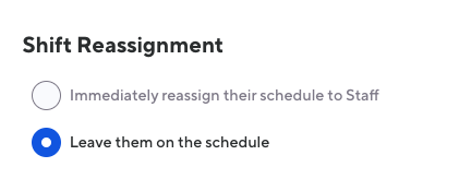 You can choose to immediately reassign their schedule to Staff or to leave them on the schedule as is. If you are reassigning their schedule all services will no longer have their name listed as the main staff member. Instead, the schedule will say “Staff”.