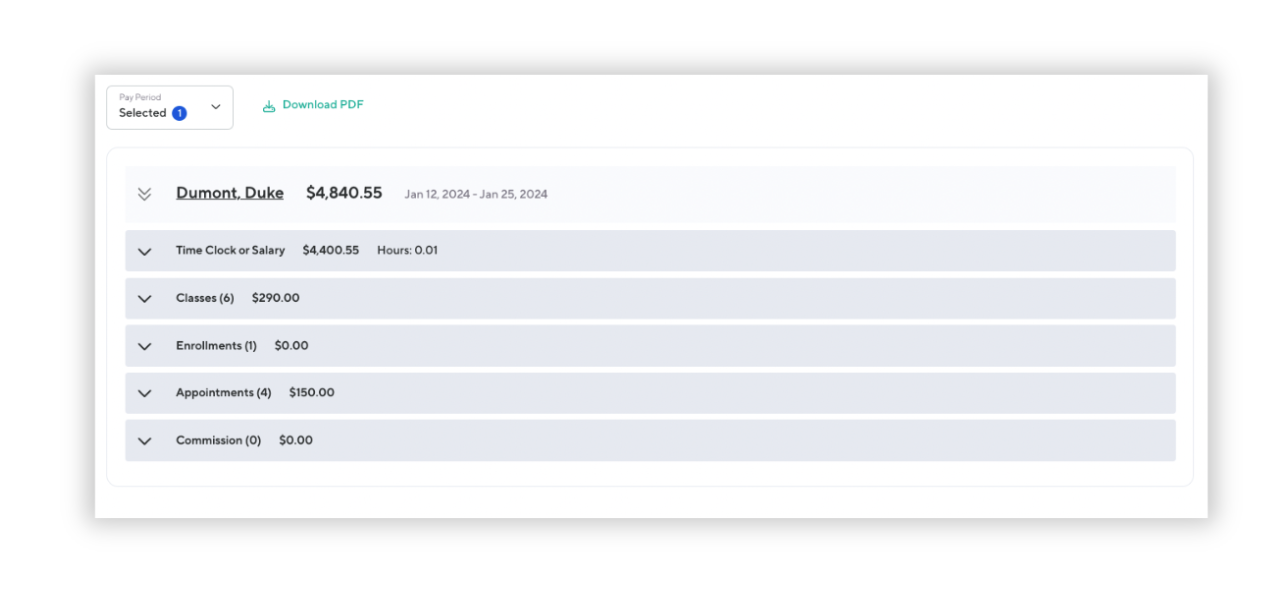 The data includes details about your staff member’s earnings, time clock or salary information, hours worked , classes, enrollments, appointments, and commission. Edits can not be made from this page by any staff permission level. To make changes to payroll edits must be made directly under Payroll.
