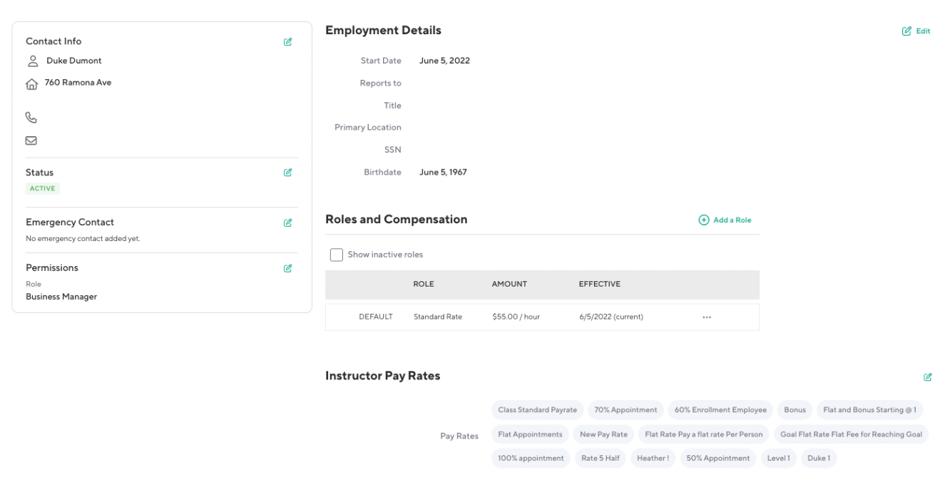 Understand the roles and permissions of each team member. In this example, the employee serves as both a Location Manager and an Instructor.