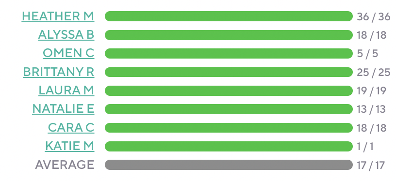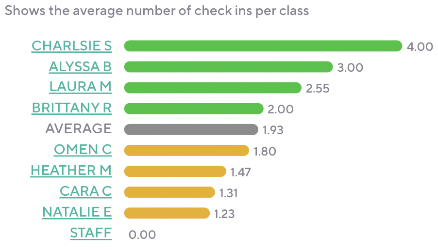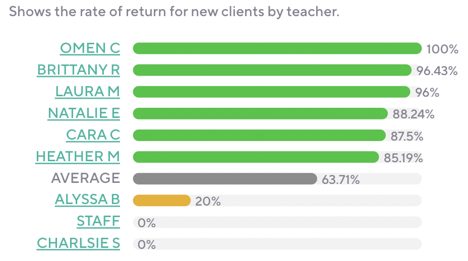 The data presented here is an accumulation of all first time students an instructor has had since they started teaching classes through the timeline selected. It is a broad view of determining how likely a student is to return to your business if their first class was with a specific instructor.