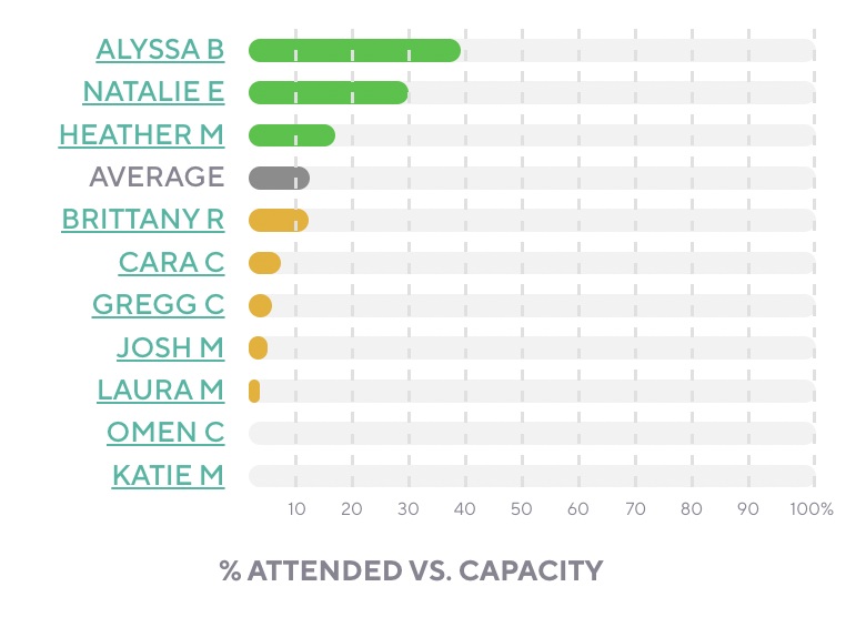 You can use this report to get a comprehensive picture of the performance of your instructor. Analyze attendance and revenue metrics for your instructors over time to evaluate their performance. Select an instructor’s name to view their Instructor Stats.