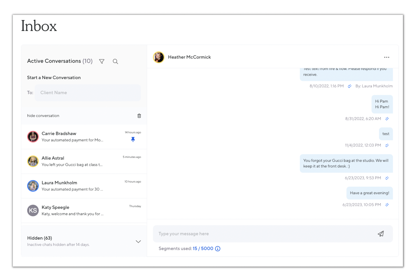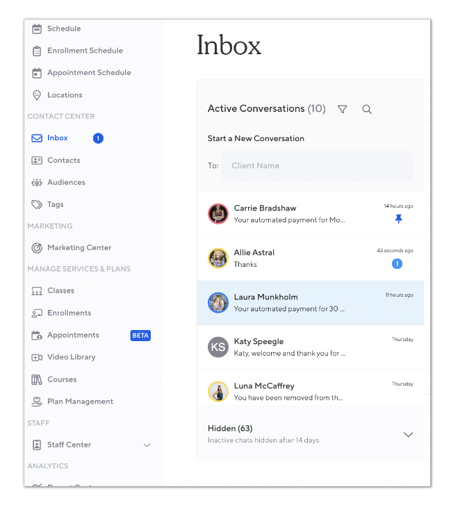 Welcome to the Inbox! The Inbox is designed to help you effortlessly manage all your client text messages in one convenient place. Whether you're keeping in touch with clients using the Marketing Suite, wanting to view Transactional Notification sms texts sent to clients, or sending important updates from the class roster, the Inbox has got you covered.