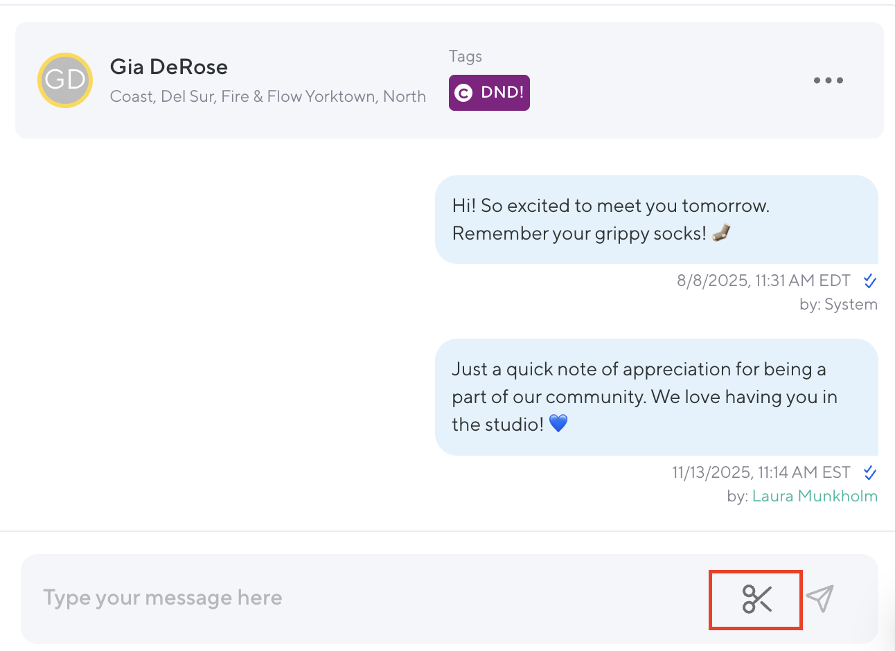 To use a Snippet, click the scissor icon in the Inbox message screen and select the desired Snippet. The message will automatically populate into the message bar.