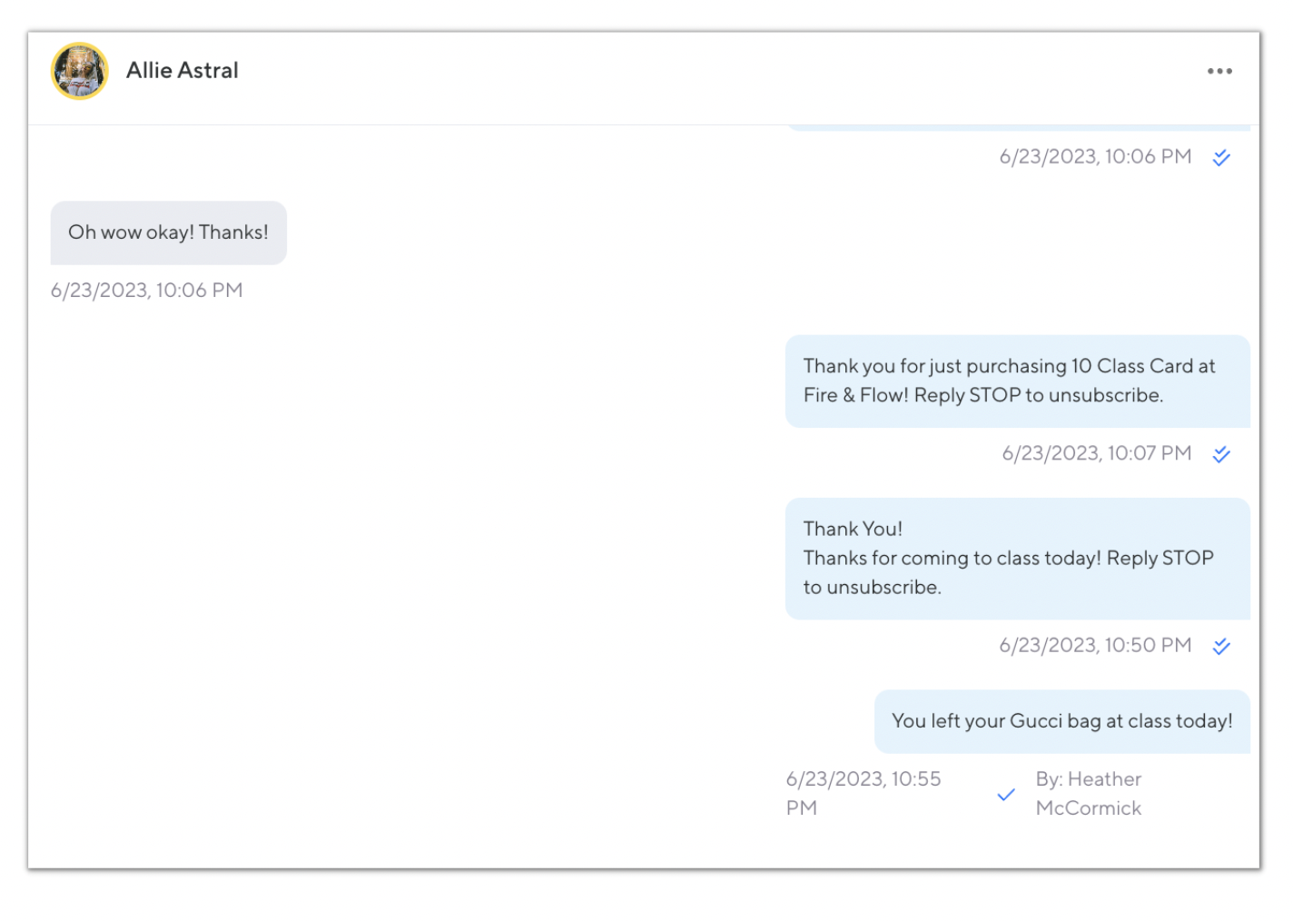 The Inbox includes all the text messages you've sent to your clients. This means you can find texts sent via Messages on the client profile, class and enrollment rosters, and even through appointments. Additionally, any Transactional Notification text messages you send will also be stored here.