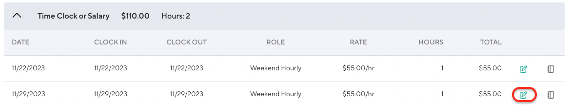 Choose the teal edit pencil to edit the time clock entry