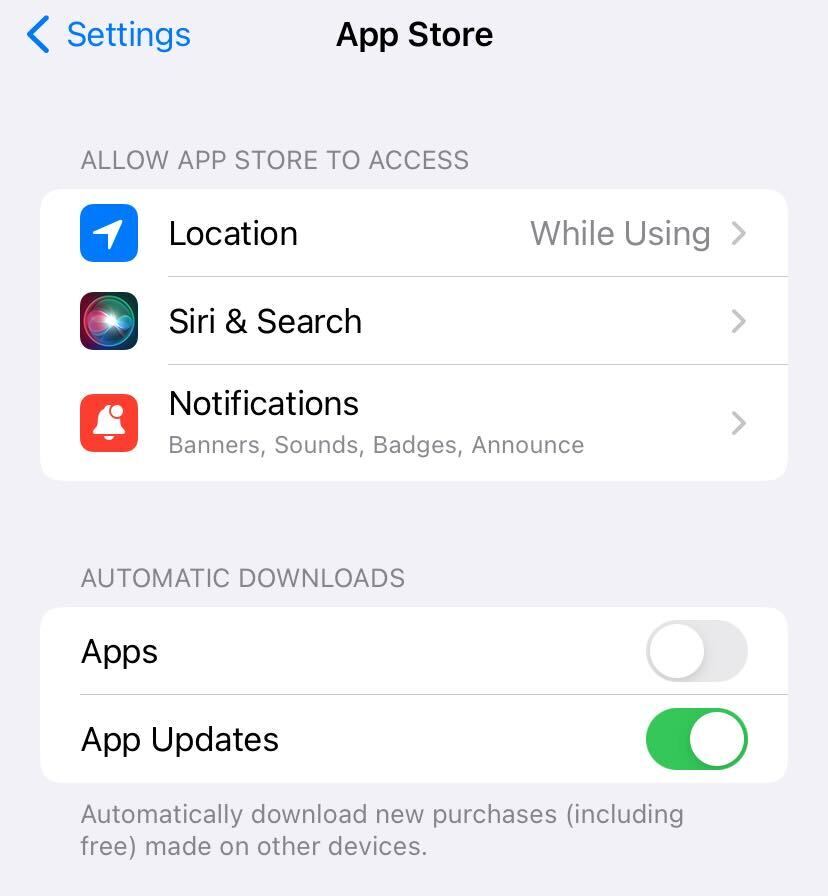 Turn on the App Updates toggle under the section titled Automatic Downloads